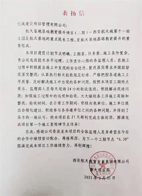 为表彰先进、交流经验、切实加强与各单位的良好合作关系,3月23日,陕西省西咸新区空港新城安居置业有限公司(以下简称:空港安居置业)对合作单位进行了表彰,亿诚建设项目管理有限公司被授予“优秀造价咨询单位”。