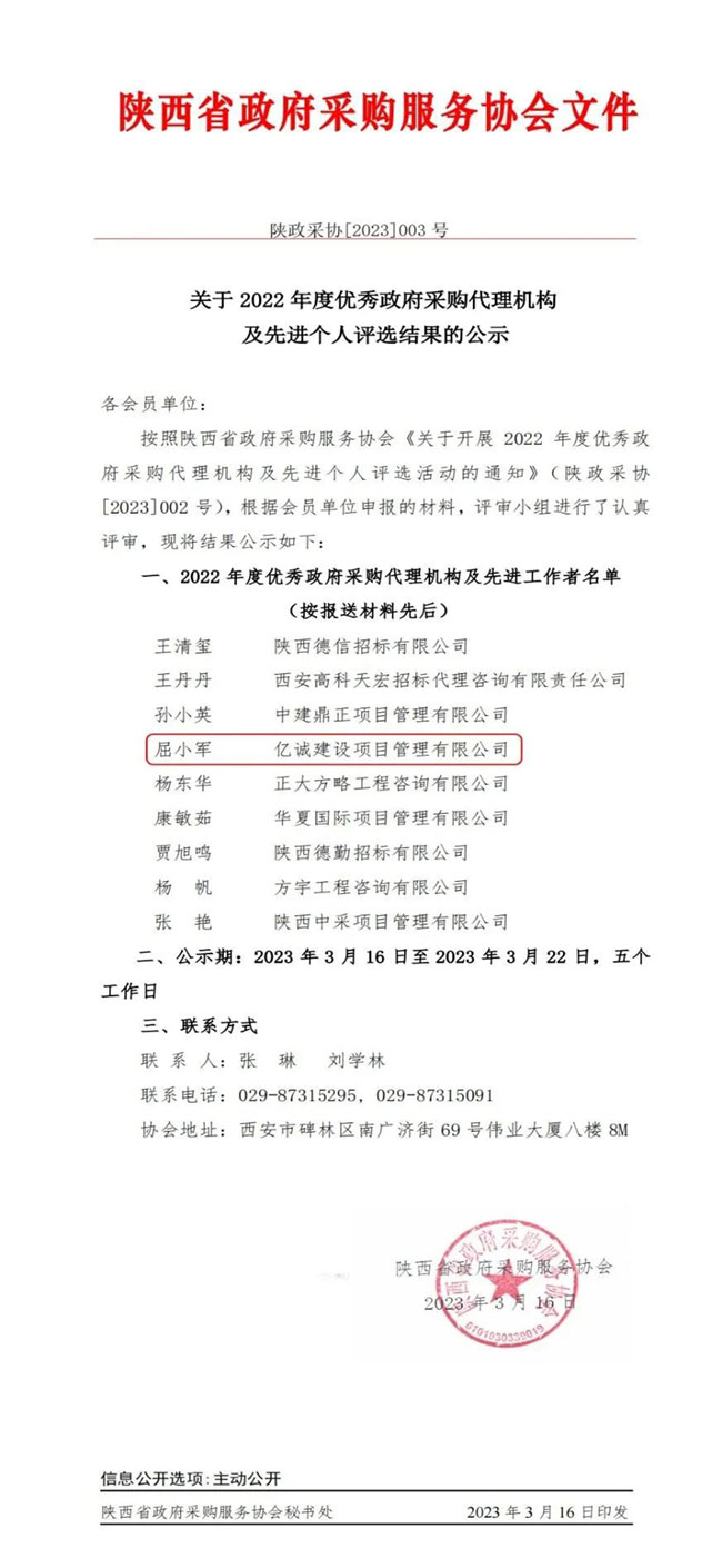 亿诚管理屈小军总工获评“2022年度陕西省政府采购代理机构先进工作者”荣誉称号!