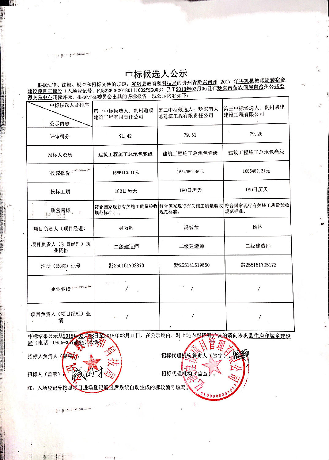 贵州省黔东南州2017年岑巩县教师周转宿舍建设项目三标段中标候选人公示(贵州)