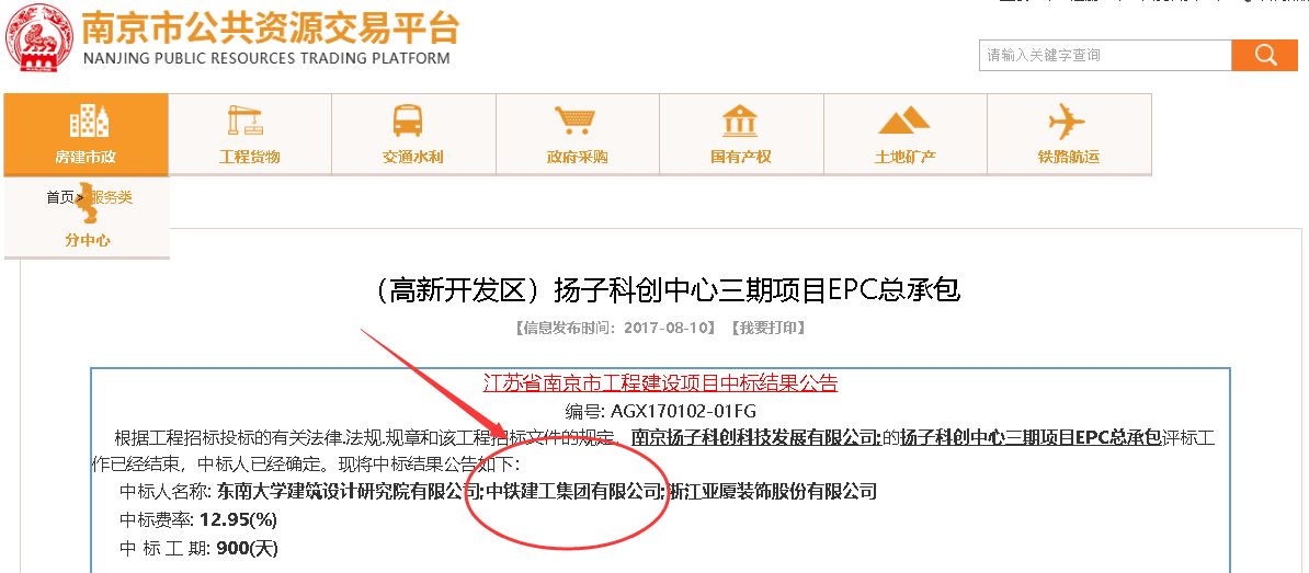2017年8月10日,南京公共资源交易中心发布公告:东南大学建筑设计院、中铁建工、亚厦装饰公司组成的投标联合体中标;中铁建工拟派项目经理为张全安。