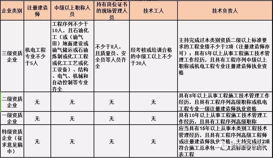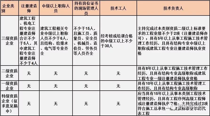 换句话说,并不是所有企业资质都不要求有建造师等企业人员。施工总承包三级资质企业对建造师等人员仍有要求,一级资质、二级资质企业保留技术负责人这一项要求,特级资质另有规定。